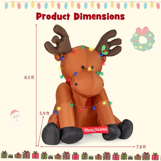 Specifications: Color Brown Material Polyester Fabric Overall Dimensions 7.8 x 5.9 x 8.5 ft Length of Power Cord 9.5 ft Net Weight 4 lbs Box Qty 1(May vary by batch) Package Includes 1 x Inflatable Reindeer Decoration 1 x Plug 1 x Air Blower 3 x Wind Ropes 4 x Water Bags 6 x Ground Stakes 1 x Instruction